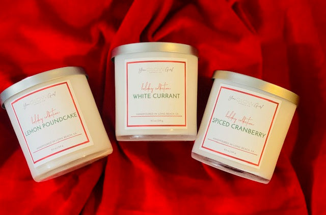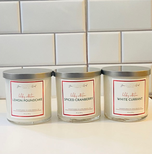 Shop our 2025 Holiday Candle Collection which features 3 limited edition holiday scented candles: Spiced Cranberry, Lemon Pound Cake, and our newest scent called White Currant. These candles are 8.5 oz and single wicked.